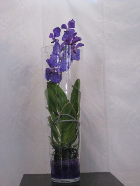 Orquidea aérea de intenso color azul, se prepara en un gran jarrón de cristal acompañada de gelatina al tono.